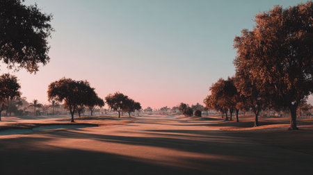 A tranquil scene capturing a golf course at dawn, with silhouetted trees casting long shadows, creating a peaceful atmosphere perfect for nature and sports enthusiasts.