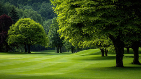 Golf course scenery. Green field, trees backdrop. Nature, sport, leisure. Relaxing landscape, outdoor activity.