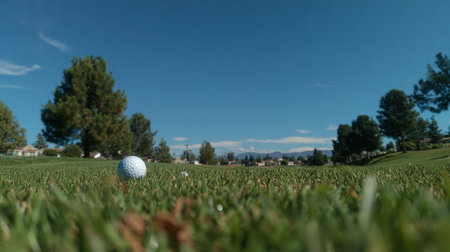 A close-up view of a golf ball resting on lush green grass, with a stunning landscape in the background and a clear blue sky, perfect for promoting outdoor sports.