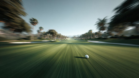 A dynamic scene capturing the motion of a golf ball on a lush fairway, surrounded by palm trees under a clear sky, evoking a sense of adventure and tranquility.