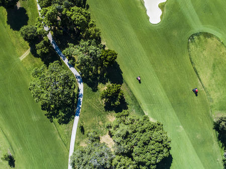 Two individuals are seen walking across a verdant golf course, carrying golf equipment. The scene showcases natural light and a composition featuring the figures set against a backdrop of trees and sky. This image is suitable for various commercial uses, including sports-related advertising or editorial content.