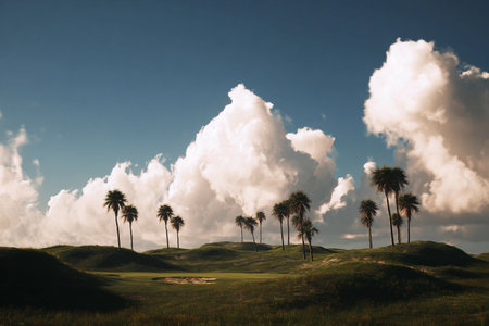 Tropical golf course featuring lush green lawn, palm trees, white sand traps, and blue sky