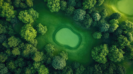 This aerial photograph captures a serene golf course surrounded by vibrant green trees, showcasing a tranquil natural landscape perfect for relaxation and outdoor activities.