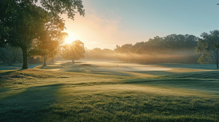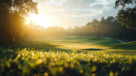 A golf course framed in a modern style, with a blurred sunrise background, capturing the early morning serenity