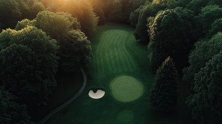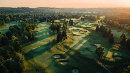 A stunning aerial view of a tranquil golf course bathed in sunset light, showcasing lush greenery, sand traps, and long shadows that create a captivating landscape.