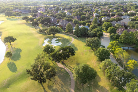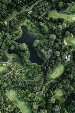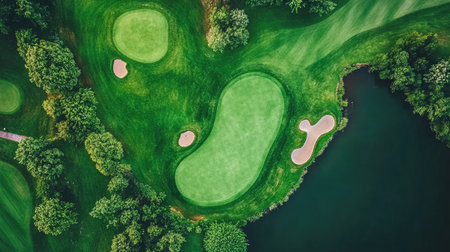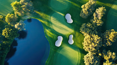 Experience the tranquility of a golf course from above, showcasing lush greens, tranquil water, and natural beauty, perfect for golf enthusiasts.
