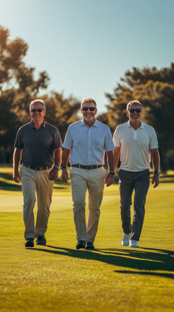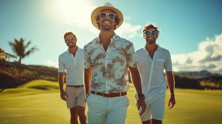 Three Stylish Male Friends, Dressed in Summer Attire, Enjoy a Sunny Day on the Golf Course