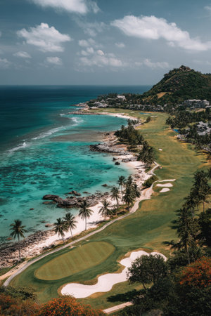 An aerial view presents a coastal landscape. Turquoise waters meet a sandy shoreline, with palm trees lining the coast. A lush green golf course extends inland. The scene is illuminated by daylight, highlighting the natural beauty. Suitable for travel or leisure content.