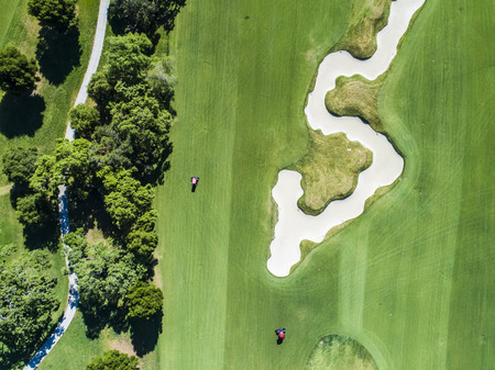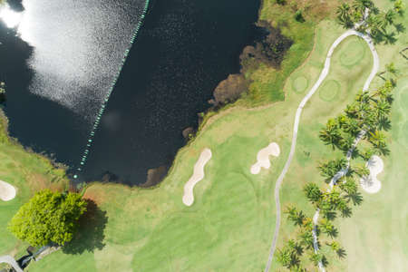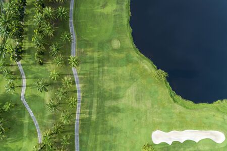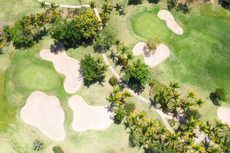 Aerial view of the green golf course in Thailand Beautiful green grass and trees on a golf field with fairway and putting green in summer season