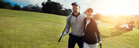 Two individuals are seen walking across a verdant golf course, carrying golf equipment. The scene showcases natural light and a composition featuring the figures set against a backdrop of trees and sky. This image is suitable for various commercial uses, including sports-related advertising or editorial content.