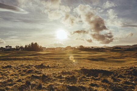 Breathtaking sunset over the hills in Brora village on the North Sea coast in Scotland, UK