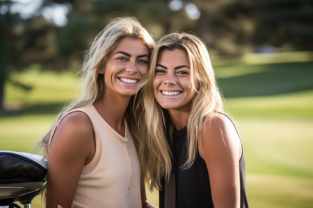 A lively group of friends smiles and walks together on a sunny golf course, embodying joy and camaraderie in stylish summer attire under the bright sky.