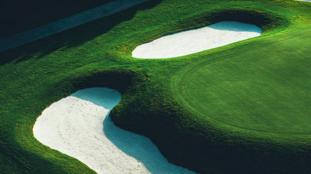 Aerial view of a stunning golf course featuring sand bunkers surrounded by vibrant green grass, showcasing the natural beauty and details of the sport.