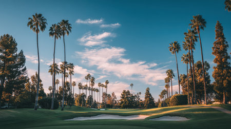 Captivating view of a tranquil golf course adorned with palm trees, complemented by a stunning sky at dusk, creating an inviting atmosphere for outdoor enthusiasts.