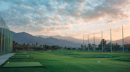 Beautiful golf driving range at sunset, showcasing lush greenery, distant mountains, and a dramatic sky filled with clouds, perfect for relaxation and sports.