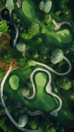 A top-down view of a golf course with various holes and hazards, showcasing the layout and design of the course as seen from above, with golfers in action.