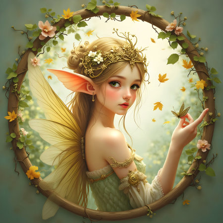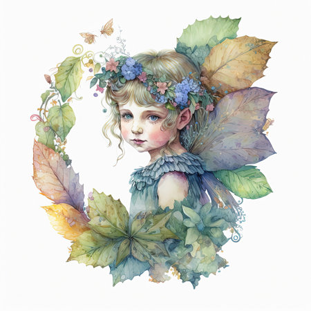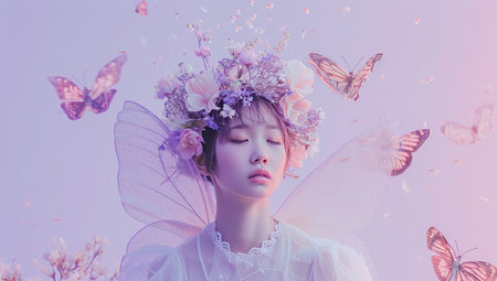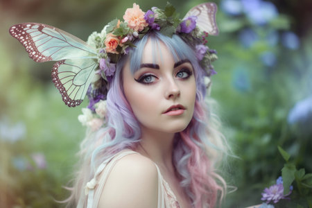 Enchanting Garden Nymph with floral headpiece, ethereal gaze, and delicate wings in a dreamy garden setting