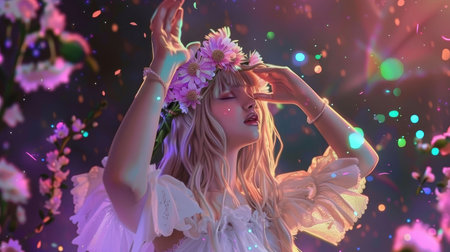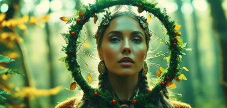 This captivating image features a young woman in a flower crown, embodying beauty and serenity in a lush forest setting. The atmosphere evokes a sense of magic and tranquility, inviting viewers to immerse themselves in nature's embrace.