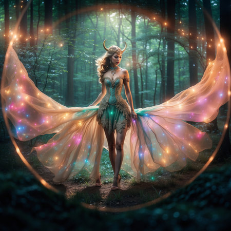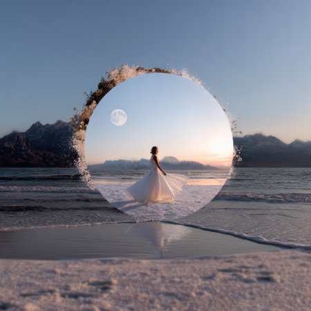 Woman in flowing white dress walks through glowing circular portal surrounded by sparkling lights, creating mystical and enchanting atmosphere