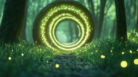 A mystical glowing portal in a serene forest setting, surrounded by vibrant greenery and illuminated by fireflies. The enchanting atmosphere evokes a sense of fantasy and wonder
