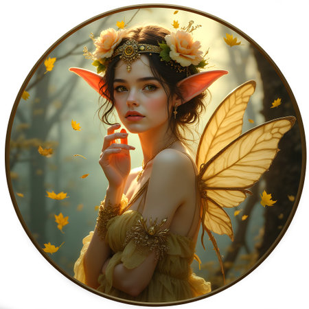 Enchanted Fairy Celebrating in a Lush Forest With Vibrant Wings Amidst Autumn Foliage.