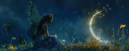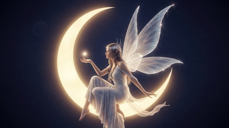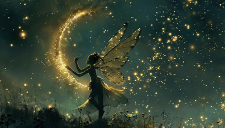 A fairy drawing patterns in the night sky using a crescent moon as a paintbrush