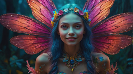 the pixie hybrid, a mesmerizing creature with delicate wings and vibrant colors, is beautifully captured in this stunning portrait photograph, showcasing its intricate features and whimsical charm, perfect for fans of mythical creatures, fantasy art, and magical realism. ai generated