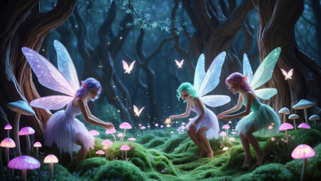 Enchanting fairies gather around glowing mushrooms in a mystical forest at twilight