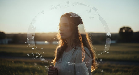 Woman is surrounded by a glowing light, with her hands outstretched. Concept of wonder and magic, as if the woman is being transported to another world