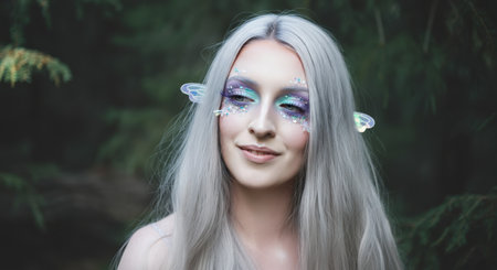 Enchanted forest fairy with silver hair and sparkling butterfly makeup