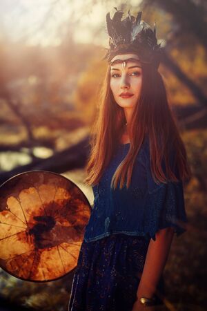 beautiful shamanic girl playing on shaman frame drum in the nature.
