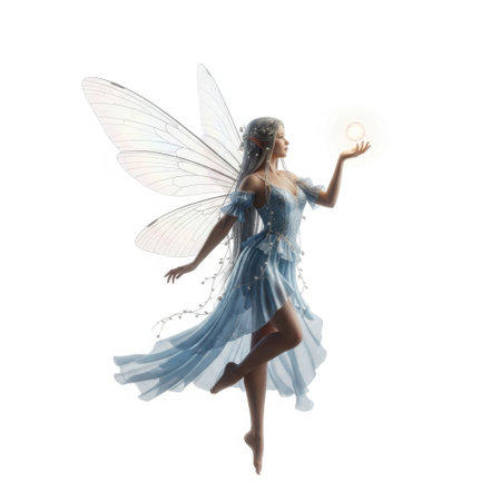 A whimsical fairy with delicate wings and a flowing blue dress is captured mid-flight, holding a glowing orb in her hand. The fairy's wings are translucent, and she wears a floral crown on her head, adding to her ethereal appearance.