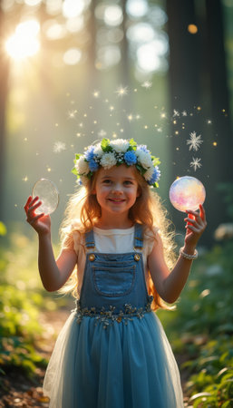 A joyful young girl with long, flowing hair wears a beautiful floral crown and holds shimmering orbs in each hand. Surrounded by a serene forest bathed in golden sunlight, she embodies the spirit of wonder and imagination, inviting viewers into a magical realm.
