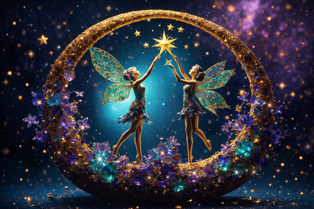 AI generated twin fairies reaching a glowing star within a golden portal surrounded by crystal flowers cosmic light harmony hope luxury fantasy illustration