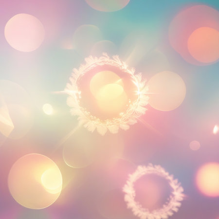 This image captures a dreamy and ethereal scene featuring soft pastel bokeh lights. The bokeh lights are scattered across the image, creating a sense of depth and tranquility. The colors range from soft pinks and yellows to gentle blues and purples, blending seamlessly into one another. The central bokeh light is the most prominent, surrounded by smaller, diffused lights that add to the overall calming ambiance.