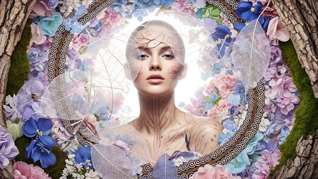 Beautiful young woman with fantasy make-up, surrounded by flowers.