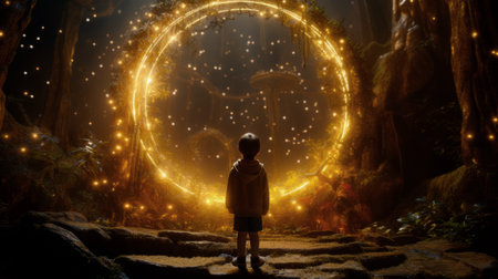 An AI generated illustration of a fictional model standing in awe of a glowing orb emitting a shower of sparks