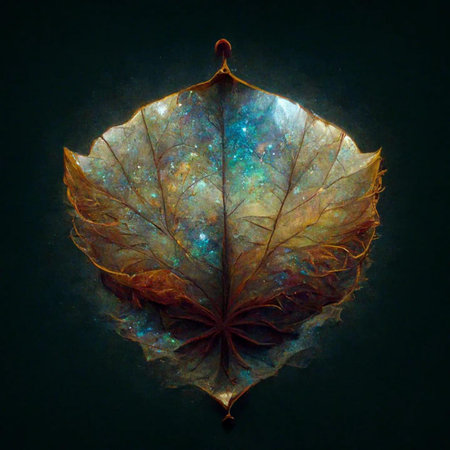 An illuminated leaf is showcased with intricate details against a dark background, reflecting in calm water. The composition employs a warm color palette with gold and orange hues. The image's ethereal quality may find application in various visual communication projects, offering a sense of wonder.