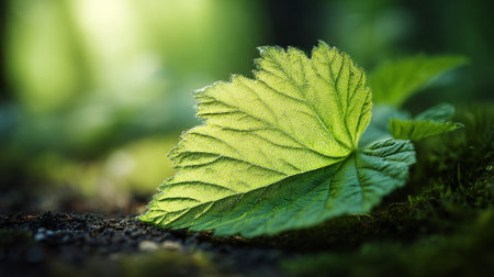 Serene Green Leaf Resting on Mossy Surface, Nature's Textural Embrace