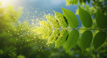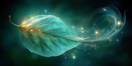 A stunning illustration of a glowing leaf drifting through a mystical green atmosphere, adorned with sparkling particles. Perfect for nature-themed designs.
