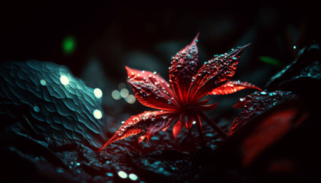 An AI generated illustration of a magical Red Poinsettia flower shimmering in the darkness