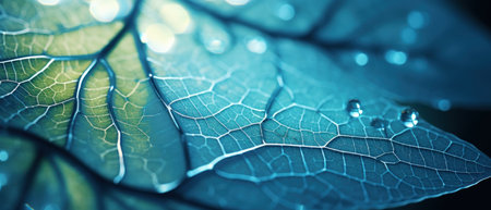 Vivid close-up of a blue leaf with sparkling water droplets, highlighting intricate textures and veins against a muted backdrop.