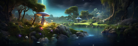 Enchanted Forest with Fields of Luminescent Flowers and Sparkling Streams in a Mystical Fairytale like Landscape Serene Tranquil and Captivating Dreamy Nature Scene