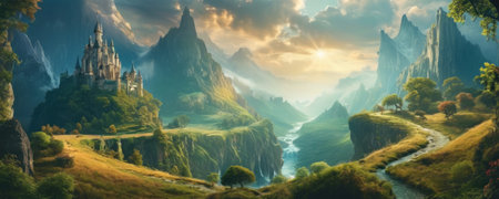 Fantasy landscape with a fantasy castle in the middle of a beautiful valley.