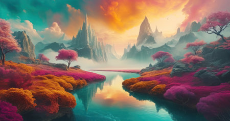 Fantasy landscape with lake and mountains. 3d render illustration.