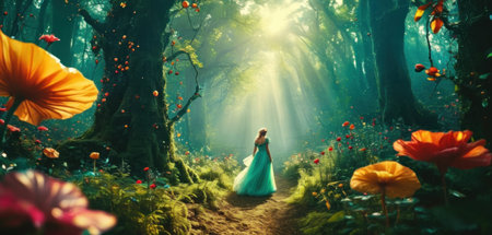 Fantasy fairy tale scene with a woman in a fantasy forest.