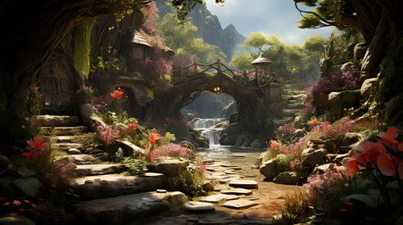 3d rendering of a fantasy fantasy garden with a waterfall in the background