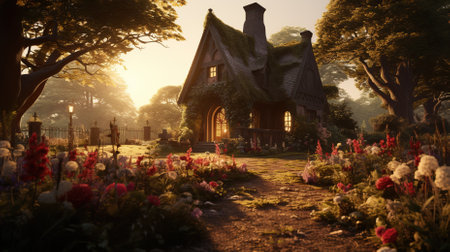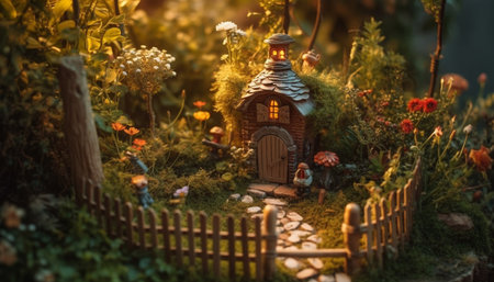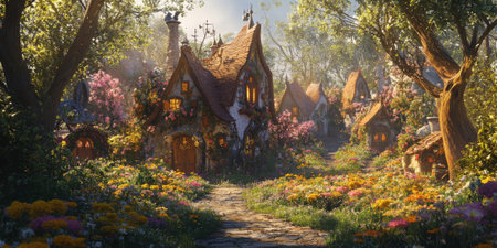A whimsical fairy village hidden in a flower garden, where time is woven with enchantment and wonder