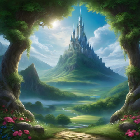 A captivating view of a vibrant landscape featuring a majestic castle atop rolling green hills, illuminated by warm sunlight and framed by fluffy clouds.