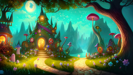 Cartoon fairy tale fantasy landscape with magic house and magic forest - illustration for children